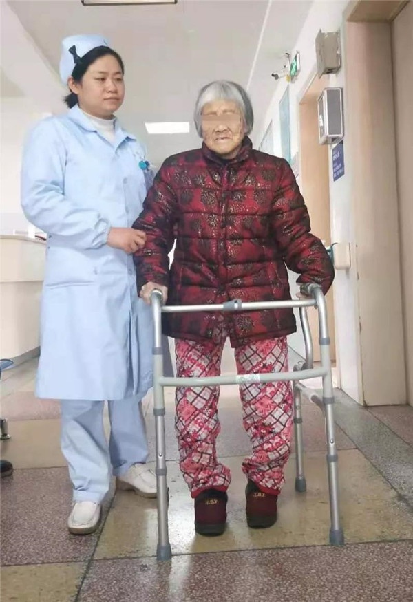 病房里,何奶奶正扶著助行器緩慢行走在病區(qū)走廊里,站在一旁兒女激動地說:“沒想到老媽這么快就能行走了,真的是太好了”。